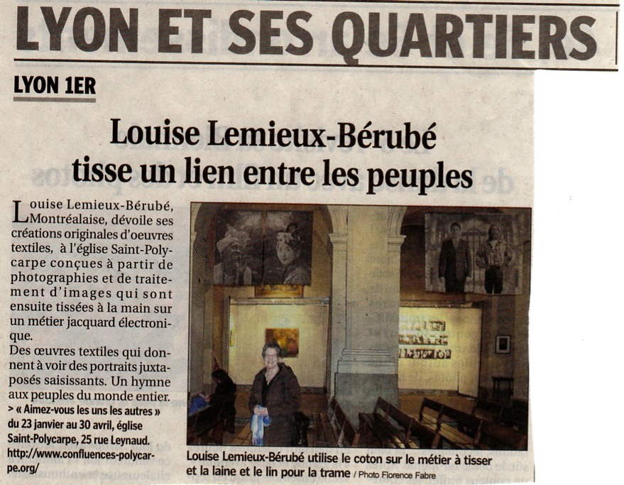 « Les panneaux de grand format, (175 x 214) intégrés à l’architecture des balcons, explique Louise Lemieux-Bérubé, me permettent de jumeler ma passion pour la photographie et le tissage et mon désir d’intégrer d’autres formes d’art dans mon propre travail. Mais bien plus encore, ils sont une réflexion sur nos rapports avec la nature et l’histoire, et surtout sur nos rapports avec les “autres†».